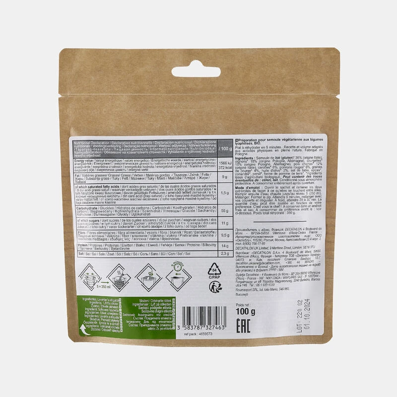 Nous avons développé ce plat à base de semoule et légumes biologiques afin de vous proposer une recette équilibrée sans viande.Il vous suffira de le réhydrater à l’eau chaude ou froide pour profiter d’un apport énergétique adapté (372 kcal/portion).